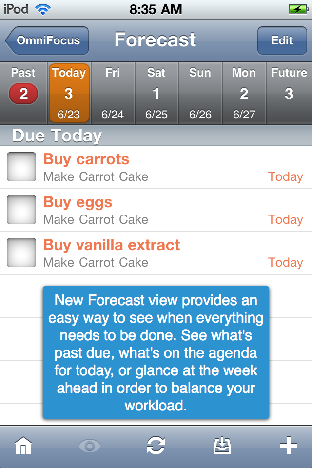 • Use OmniFocus for iPhone Forecast for an easy way to see when everything needs to be done. Deal with urgent items in the Overdue view, see what's on the agenda for today, and glance at the week ahead to balance your workload. (This feature replaces the Overdue and Due Soon lists.)
