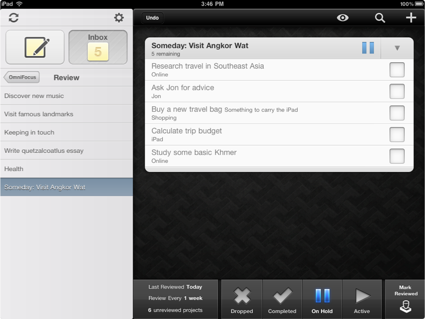 Use Review mode to keep watch of your ever-changing needs and stay engaged with your entire OmniFocus document. Check-in with your items and update their statuses. Reactivate on hold projects or drop items that you know you won't get to. Ongoing reviews help you maintain your peace of mind by knowing you've got everything exactly where it needs to be.