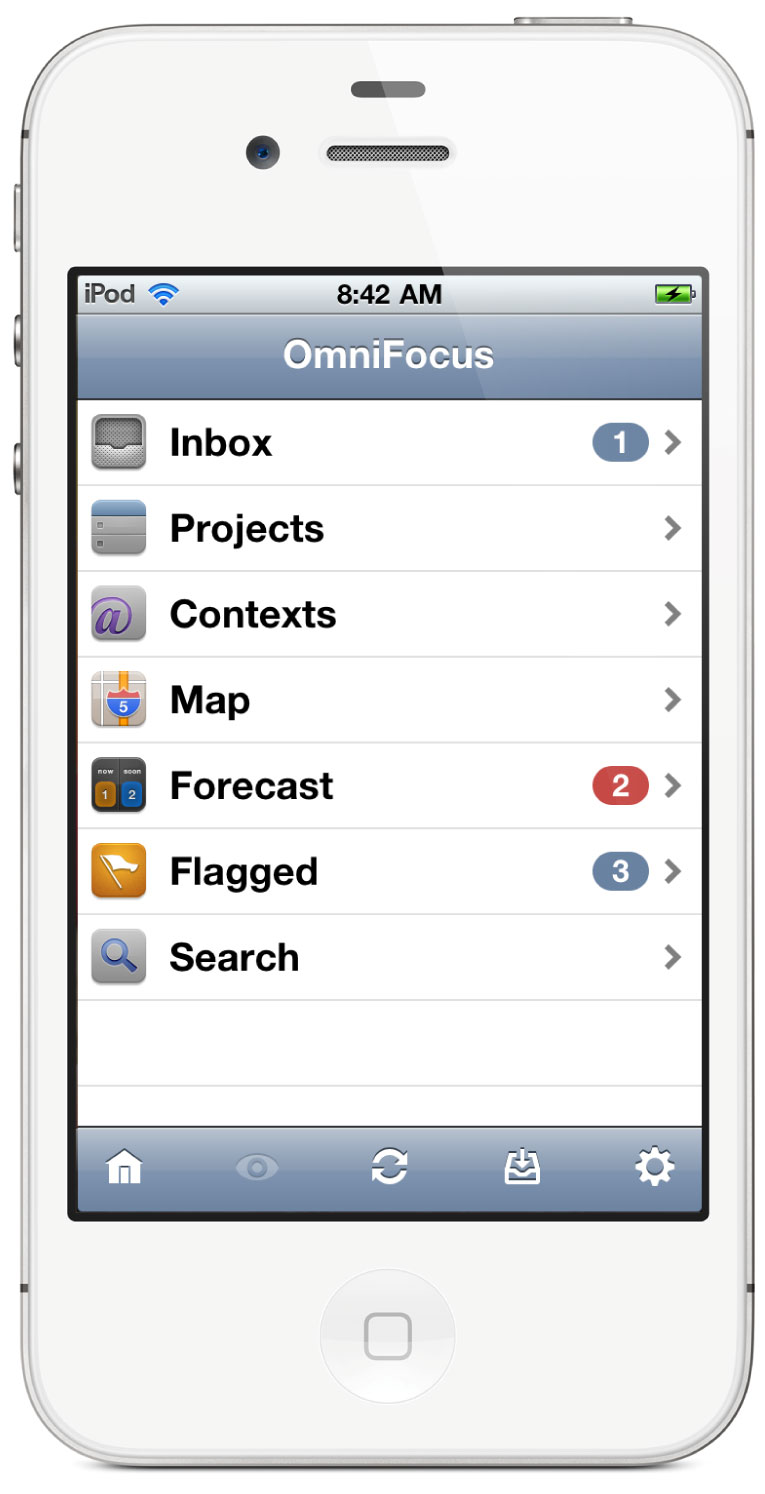The top-level screen is your starting point for using OmniFocus—you can always get back to it by tapping the Home button in the lower-left of the screen. Here you can access your inbox, where you enter new items as you think of them; your projects and contexts; items which are due soon; overdue items; and items you have marked with a flag.
