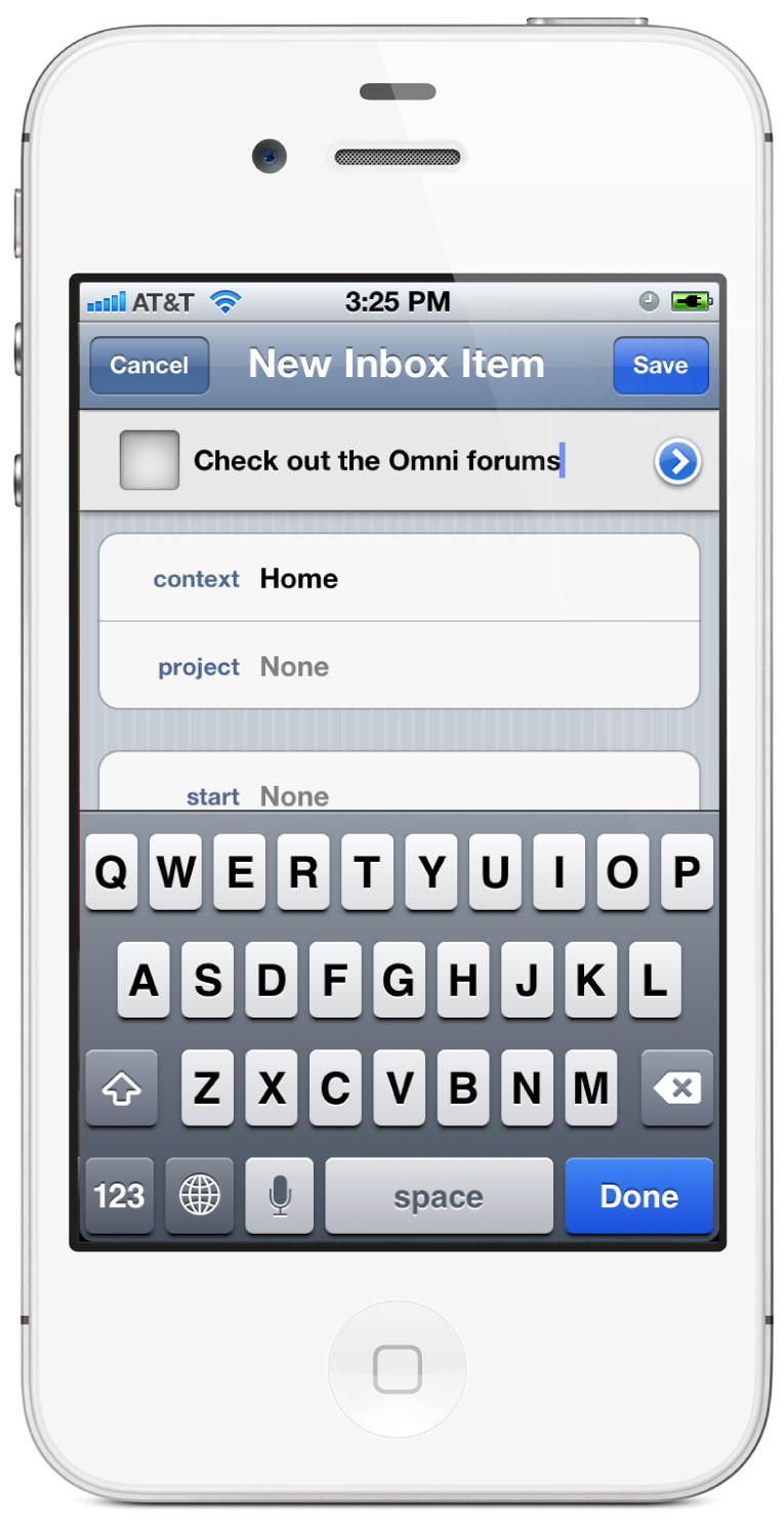The inbox is where you can quickly add items as you think of them. It’s designed to be a kind of catch-all for everything that’s on your mind, and you can store items in your inbox until you’re ready to process and categorize them. To add a new item, just tap the New Inbox Item button in the toolbar, type whatever’s on your mind, tap Save, and you’re done.