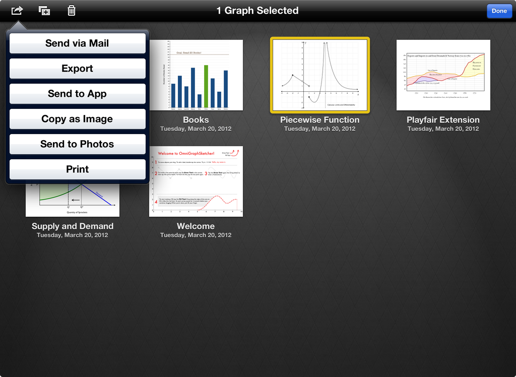 Save your graphs to an iDisk or WebDAV server for easy collaboration with other OmniGraphSketcher users, or just email a PDF or PNG for quick approval. You can "Copy as Image" and paste into Pages or Keynote with just a few taps, or send a graph to the Photos application. Teaching a class or giving a talk? Plug in a VGA adapter and let your audience follow along as you create graphs on the big screen.
