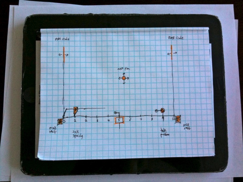 Here's Robin's own iPad-sized hardware prototype (!) with a variety of UI element ideas designed by our User Experience lead, William Van Hecke.