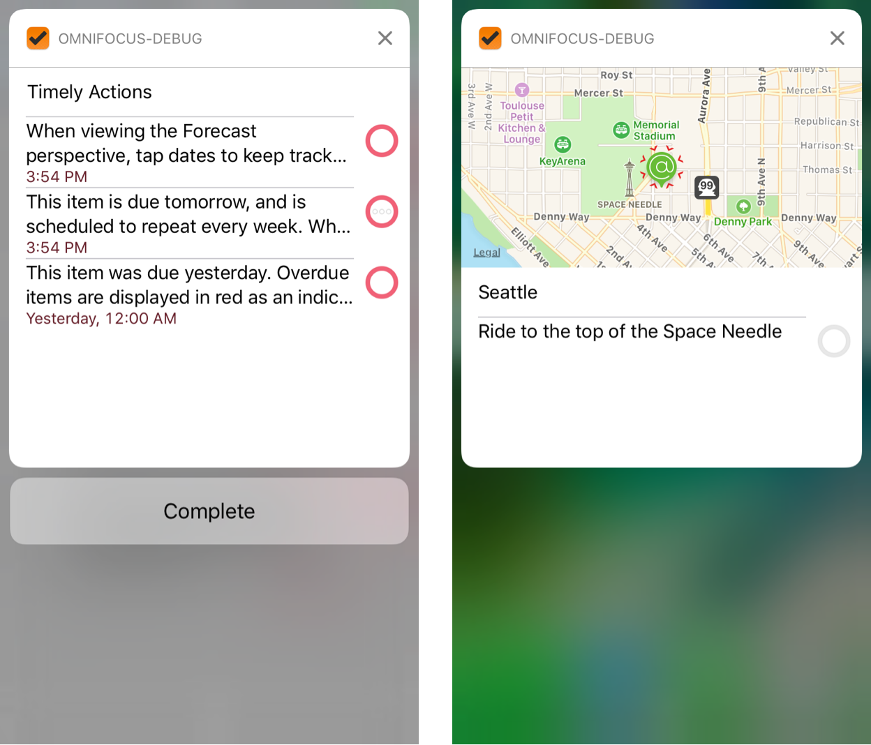 In the screenshots above, the left notification is showing the details for several tasks all at once. The right notification shows a map to the nearby location that triggered it, along with listing the tasks that OmniFocus is reminding you to do there.